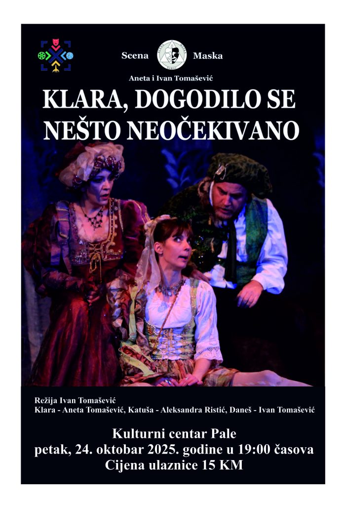 Позоришна представа „Клара, догодило се нешто неочекивано“ у извођењу сцене „Маска“ из Шапца биће одиграна на сцени Културног центра Пале у петак, 24. октобра 2025. године, са почетком у 19 часова. У представи играју Анета Томашевић у улози Кларе, Иван Томашевић као Данеш и Александра Ристић као Катуша. Текст представе написали су Анета и Иван Томашевић, а режију потписује Иван Томашевић.