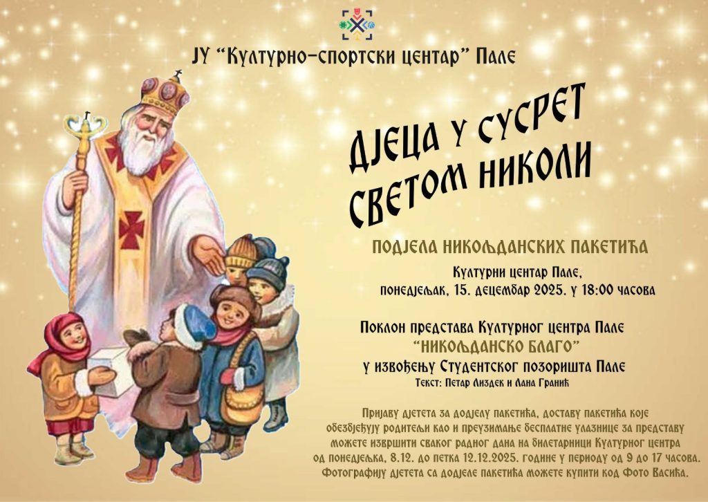 Светог Николу, заштитника дјеце, дочекаћемо у Културном центру Пале у понедјељак, 15. децембра 2025. године, у 18.00 часова.