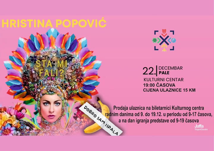 Културни центар Пале са задовољством најављује гостовање хит представе „Добро сам испала – шта ми фали“, која ће бити изведена у недјељу, 22. децембра, са почетком у 19.00 часова, на сцени Културног центра.