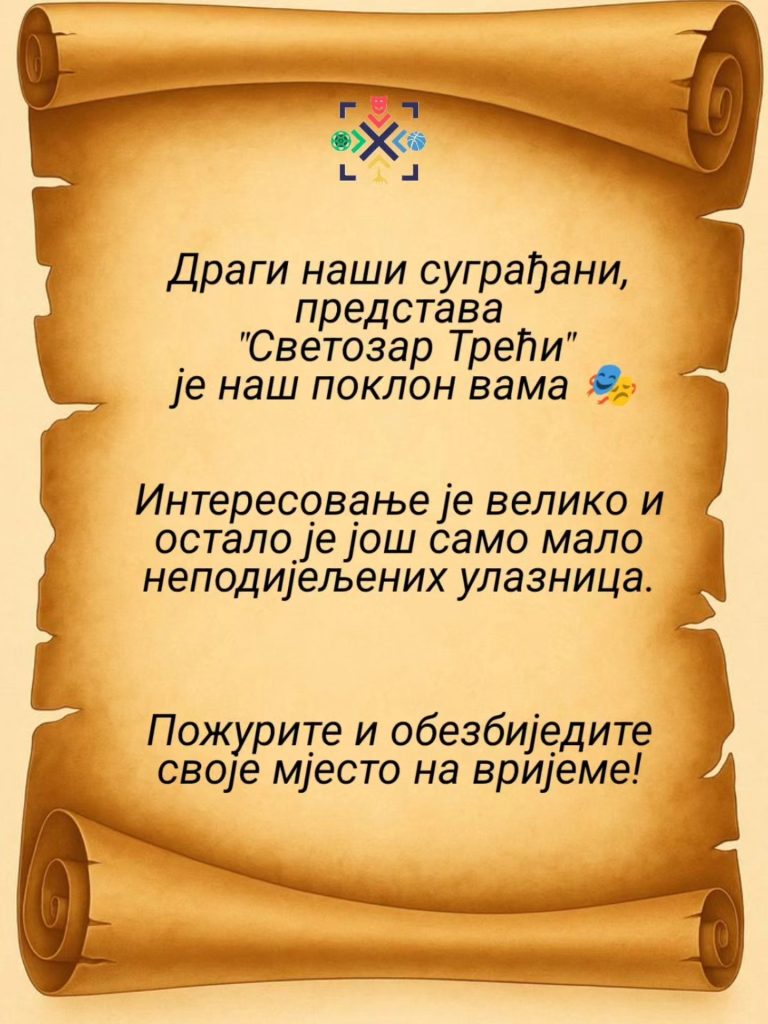 Обавјештење 📢 24/02/2026 Репертоар Обавјештење Остало је још мало неподијељених карата за поклон представу „Светозар Трећи“ Кретање чланка Одиграна представа „Дечије повреде“ Подијели 0 comments on “Обавјештење 📢” Comments are closed.