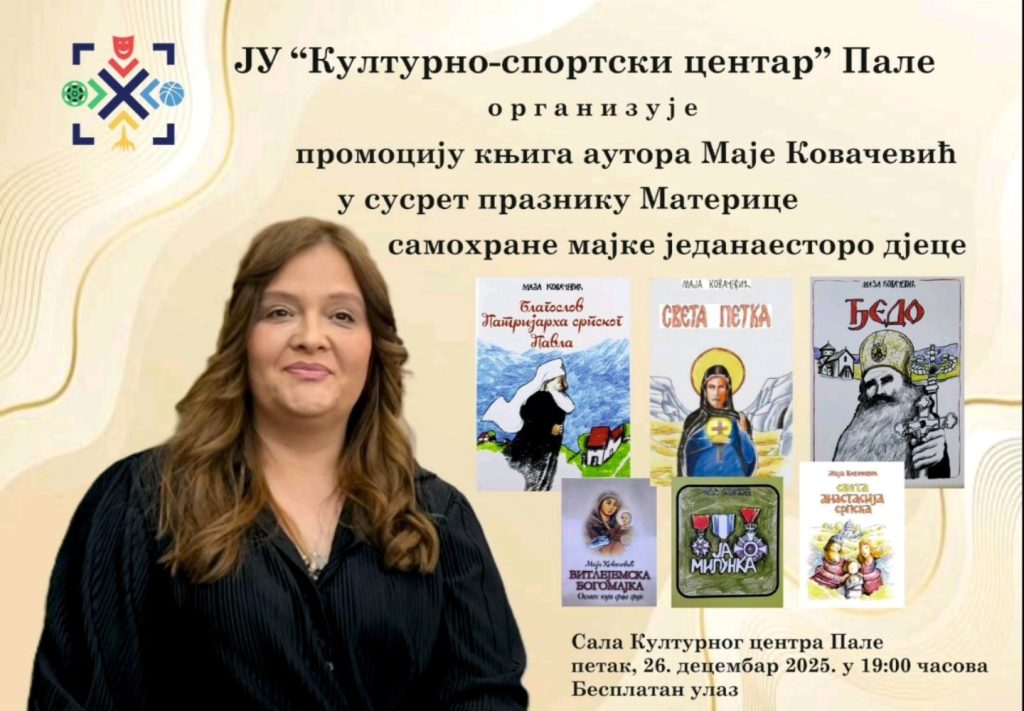 ЈУ „Културно-спортски центар“ Пале организује промоцију књига ауторке Маје Ковачевић, познате као српске мајке храбрости, ауторке више књига које се баве темама историје, вјере и личности блиских православној традицији.