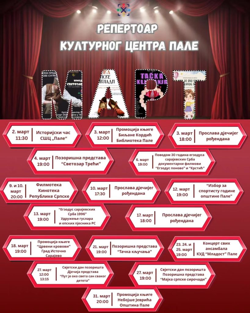 Репертоар Културног центра Пале за мјесец март
