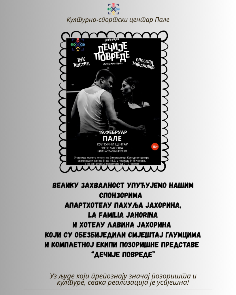 Захвалница спонзорима 11/02/2026 Репертоар Кретање чланка Представа „Дјечије повреде“Одиграна дјечија представа „Гусар“ Подијели 0 comments on “Захвалница спонзорима” Comments are closed.